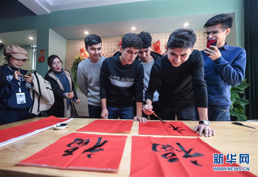12月27日,外國(guó)留學(xué)生在瓜山新苑社區(qū)活動(dòng)中心參加迎新年活動(dòng),學(xué)習(xí)用毛筆寫福字。新華社記者 徐昱 攝