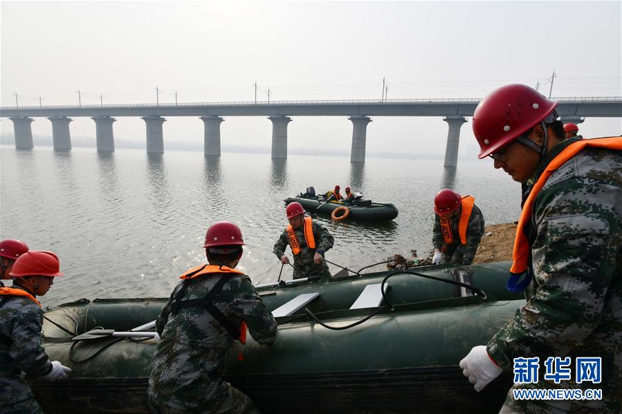 1月3日,中國鐵路濟南局鐵道戰(zhàn)備舟橋處工程人員準備船只前往預(yù)定地點檢查橋墩。