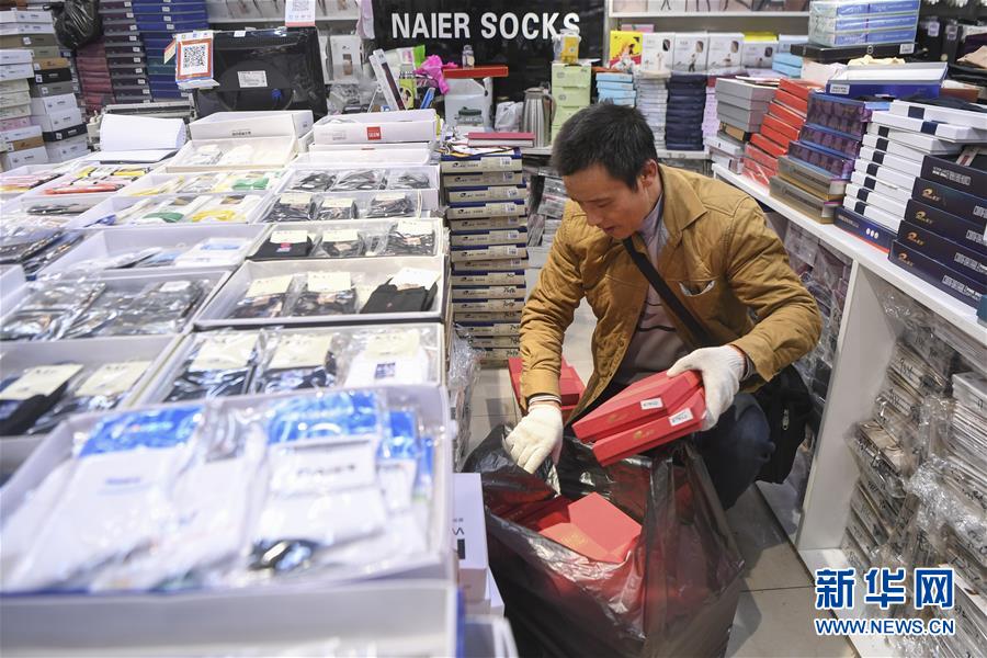 冉光輝在重慶朝天門(mén)大正商場(chǎng)內(nèi)整理即將搬運(yùn)的貨物(1月5日攝)。新華社記者王全超攝