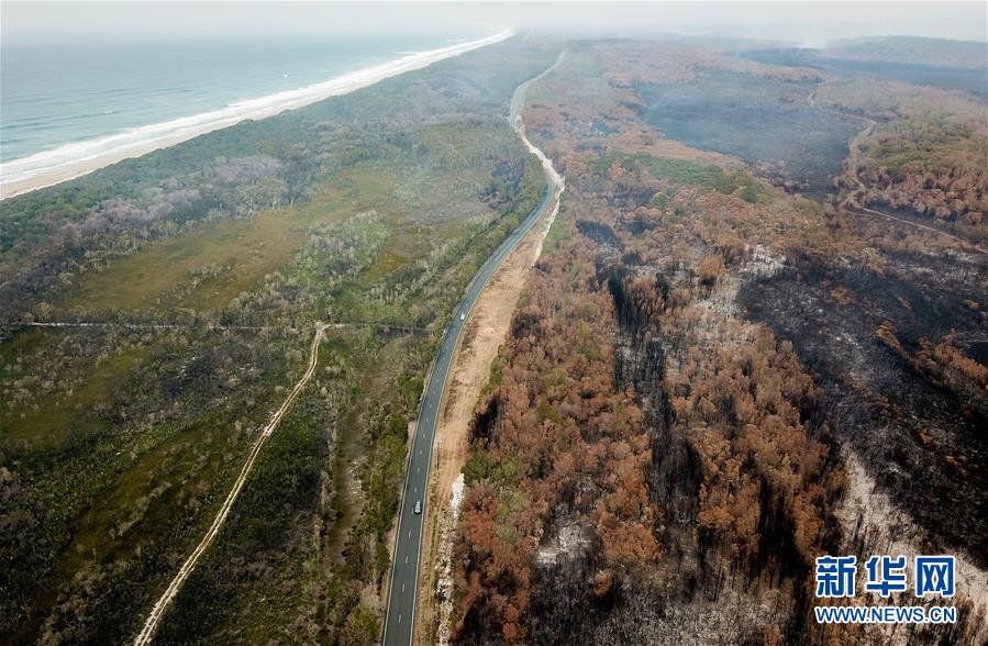 這是11月11日航拍的澳大利亞新南威爾士州麥夸里港附近的過(guò)火林地(右)。新華社記者白雪飛攝