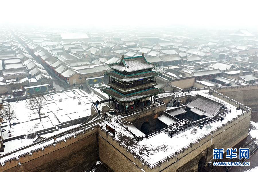 1月5日拍攝的平遙古城迎薰門城樓(無人機照片)。新華社記者詹彥攝