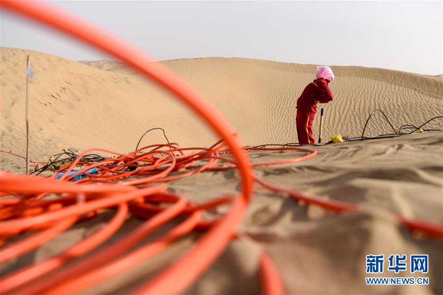 1月14日,放線工張進(jìn)秀在放完一組檢波器后直起腰休息。地球物理勘探是油氣開(kāi)發(fā)的第一步,相當(dāng)于給地球做CT。物探工人按照嚴(yán)格的測(cè)線部署,在相應(yīng)位置鉆井,然后實(shí)施地震,采集地震波數(shù)據(jù)??蒲腥藛T通過(guò)數(shù)據(jù)組成的“CT片”,就能夠清晰地“看”到地下的地質(zhì)結(jié)構(gòu),判斷哪里埋藏有石油或者天然氣。2019年10月,東方地球物理勘探有限責(zé)任公司塔里木物探處2113隊(duì)進(jìn)入新疆塔克拉瑪干沙漠腹地,開(kāi)始中古14-21、塔中2兩個(gè)區(qū)塊的三維地震勘探。近2000名物探工人將在1000平方公里的范圍內(nèi)一直工作到2020年4月,這也意味著他們將在塔克拉瑪干沙漠腹地連續(xù)度過(guò)第14個(gè)除夕夜。蘊(yùn)藏著豐富石油天然氣資源的新疆塔克拉瑪干沙漠有“死亡之?!敝Q,氣候干燥,年降水量在50毫米以下,冬季地表最低溫度超過(guò)零下30攝氏度,是世界油氣勘探難度最大的地區(qū)之一。為避開(kāi)風(fēng)季,物探工人每年9、10月份進(jìn)入沙漠,一直工作到來(lái)年4月,夜以繼日與黃沙、嚴(yán)寒為伴,用辛勤的汗水,為祖國(guó)找油找氣。新華社記者丁磊攝