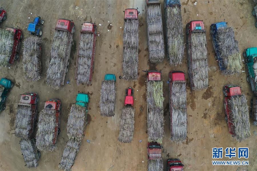 1月13日,運(yùn)蔗車輛排隊(duì)進(jìn)入鹿寨縣一家制糖企業(yè)(無(wú)人機(jī)照片)。新華社記者黃孝邦攝