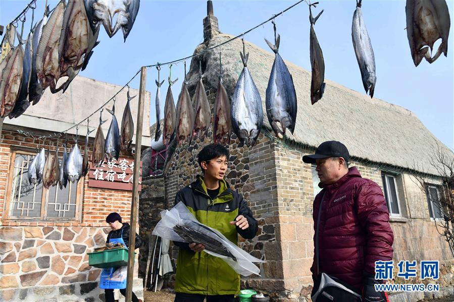 在榮成市煙墩角村,于海洋(中)向游客介紹自家晾曬的鲅魚(1月12日攝)。新華社記者 郭緒雷 攝