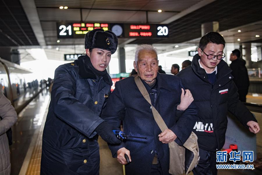 吉如(左一)在西安北站的站臺上協(xié)助旅客乘降,確保旅客安全乘車(1月14日攝)。今年春運列車開行密度大,站臺崗位人員緊張,吉如時常被調(diào)到站臺進行站臺服務(wù)工作。 新華社記者 陶明 攝