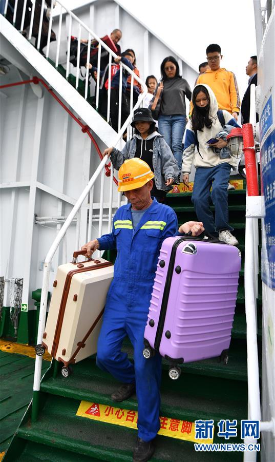 1月19日,客滾輪工作人員幫助乘客搬運行李。 新華社記者 郭程 攝