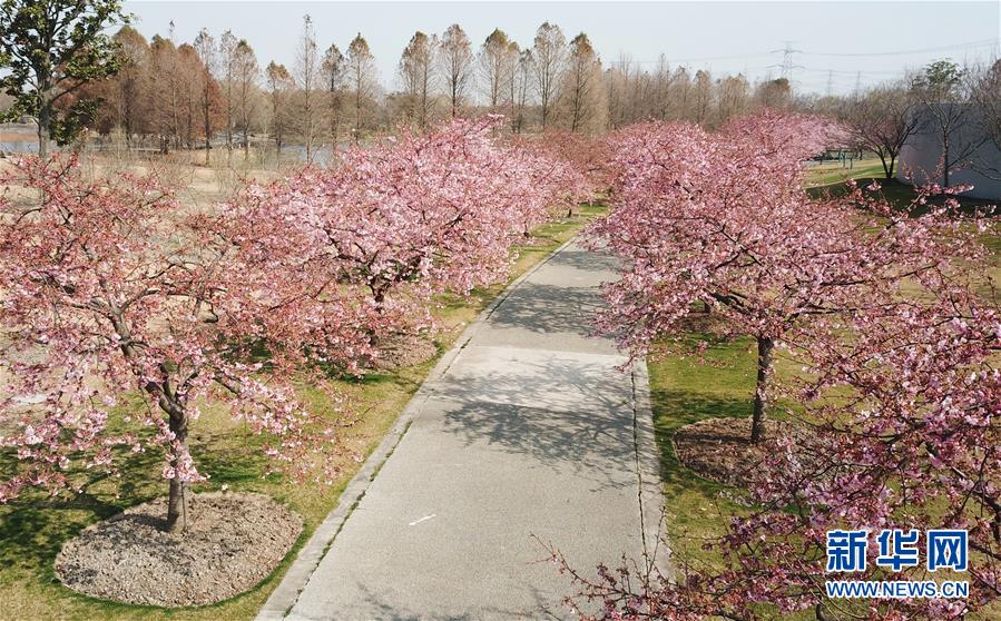 這是2月24日在上海松江辰山植物園內(nèi)拍攝的櫻花小徑(無人機照片)。 新華社記者 方喆 攝