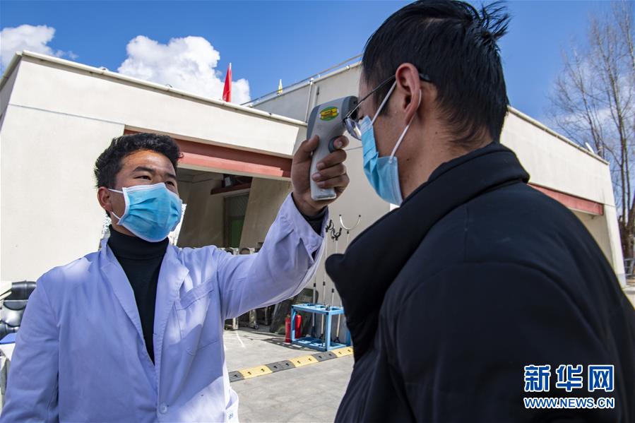 西藏大學醫(yī)學院預防專業(yè)本科生次成郎加(左)在學校門口為來校者測量體溫(2月23日攝)。新華社記者孫非攝