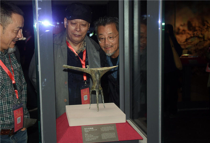 圖為參加開(kāi)館儀式的專家學(xué)者參觀“鎮(zhèn)館之寶”之一的乳釘紋銅爵酒禮器(夏,二里頭文化四期)。