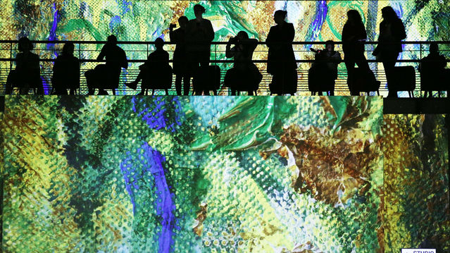 2月27日,在法國巴黎,人們在《從莫奈、雷諾阿到夏加爾:地中海之旅》光影藝術沉浸展的媒體預展上參觀。新華社記者高靜攝