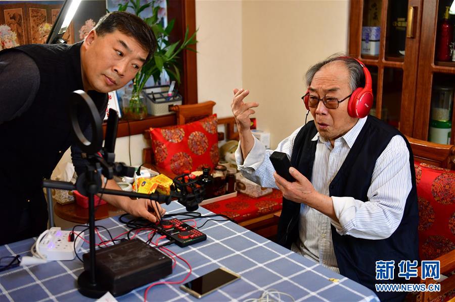 武忠(右)在直播中表演晉劇片段(3月6日攝)。 新華社記者 曹陽 攝