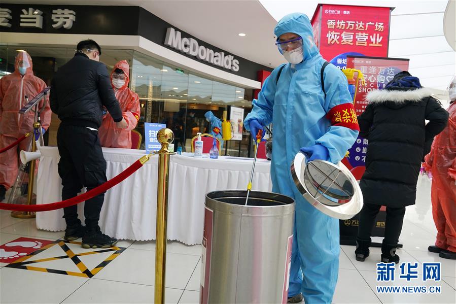 3月13日,在哈爾濱香坊萬達廣場內,工作人員在給垃圾桶消毒。 近日,哈爾濱市多家大型商場陸續(xù)恢復營業(yè)。這些恢復營業(yè)的商場采取多種措施,從嚴細致做好疫情防控和安全風險防范工作,為廣大顧客提供安全放心的購物空間。 新華社記者 王建威 攝
