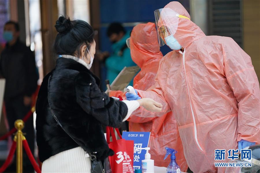 3月13日,在哈爾濱香坊萬達(dá)廣場內(nèi),工作人員在給進(jìn)店顧客測體溫。 近日,哈爾濱市多家大型商場陸續(xù)恢復(fù)營業(yè)。這些恢復(fù)營業(yè)的商場采取多種措施,從嚴(yán)細(xì)致做好疫情防控和安全風(fēng)險(xiǎn)防范工作,為廣大顧客提供安全放心的購物空間。 新華社記者 王建威 攝