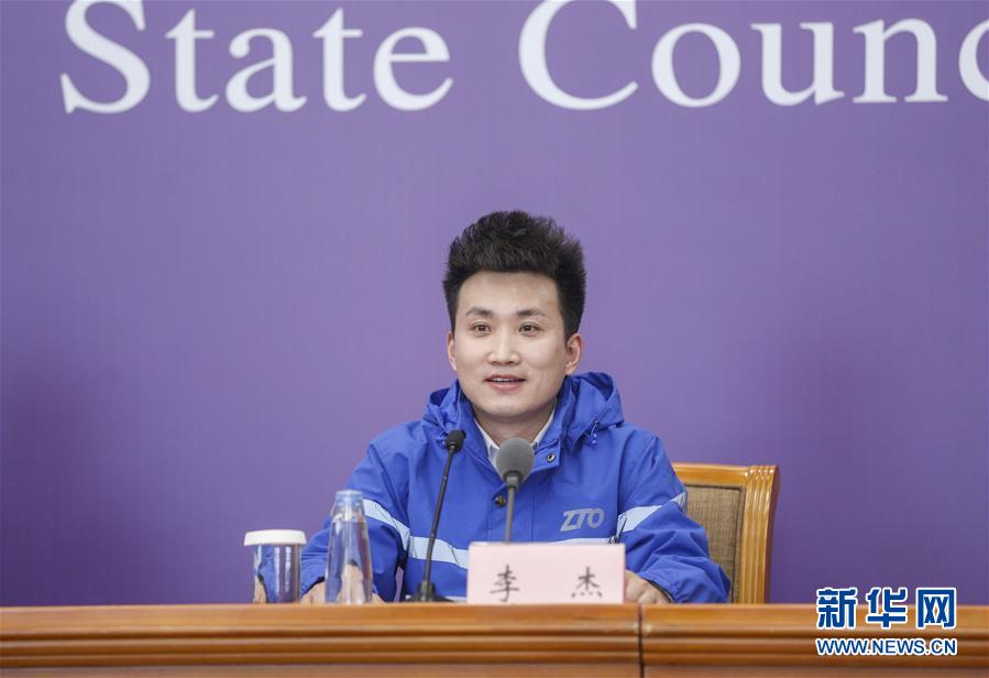 3月9日,中通快遞北京廠洼路網點快遞員李杰在北京出席國務院聯(lián)防聯(lián)控機制新聞發(fā)布會。