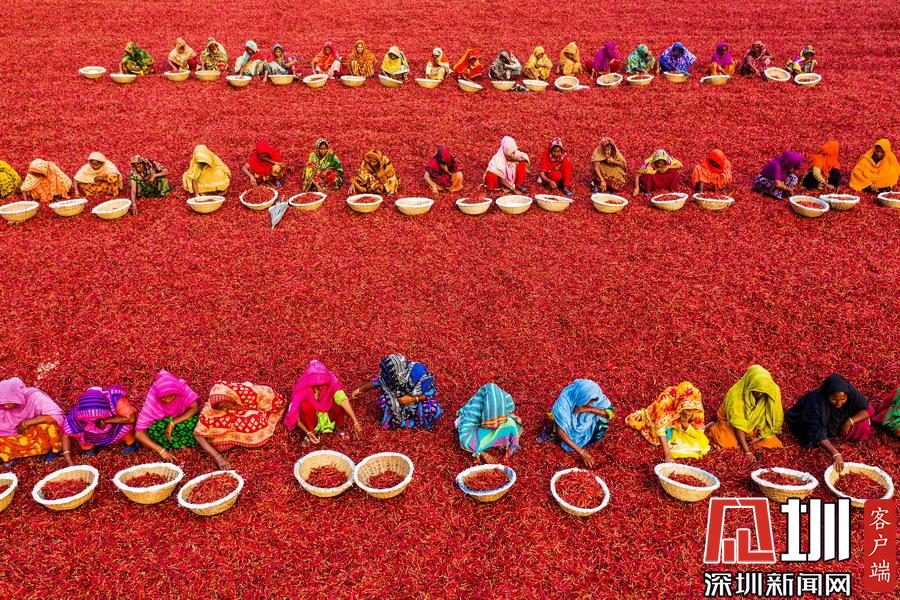 航拍孟加拉國工人分揀辣椒 滿眼火紅大地如鋪上地毯