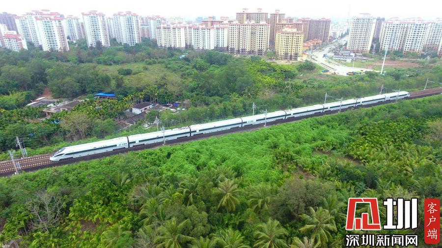 2020年3月17日,海南環(huán)島鐵路一列動(dòng)車(chē)從春光明媚的瓊海城區(qū)經(jīng)過(guò)。