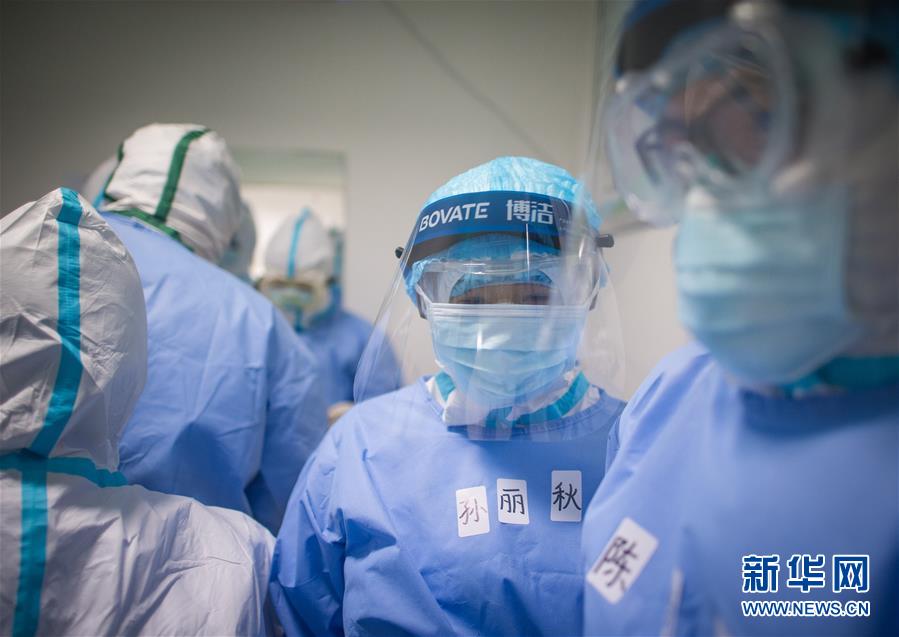 3月19日,在武漢市肺科醫(yī)院清潔區(qū),浙江醫(yī)療隊隊員孫麗秋(中)在穿戴防護服。 新華社記者 肖藝九 攝