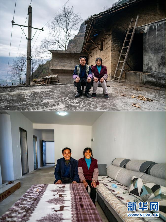 這是一張拼版照片:上圖為云南省永善縣大興鎮(zhèn)駱丘村村民王大香和丈夫晏付高在生活了二十多年的老屋前合影(3月14日攝);下圖為王大香和丈夫晏付高在新家家中合影(3月15日攝)。