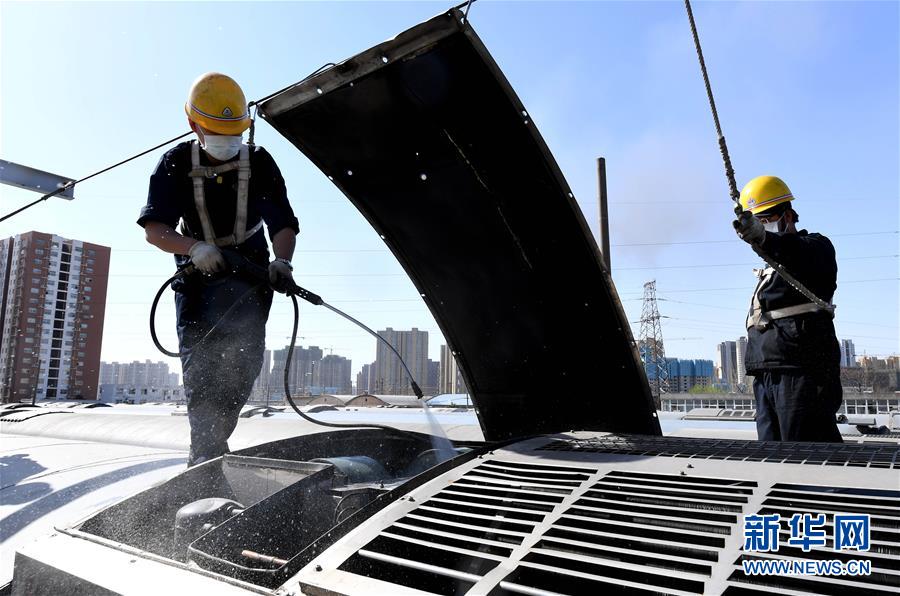 3月19日,鄭州車輛段客車檢車員在對客車空調(diào)機(jī)組蒸發(fā)器、壓縮機(jī)等內(nèi)部設(shè)備進(jìn)行清洗。新華社記者 李安 攝