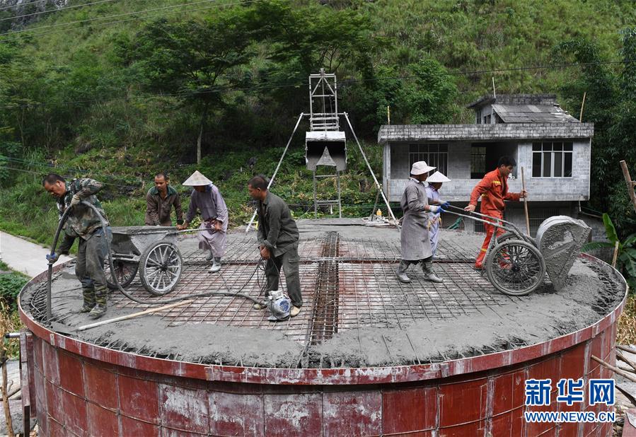 在廣西大化瑤族自治縣板升鄉(xiāng)弄勇村,群眾在修建家庭水柜(2017年9月2日攝)。廣西有近一半貧困人口生活在石漠化地區(qū),涉及數(shù)十個(gè)縣區(qū)。這里也是廣西飲水保障程度最低的地區(qū),解決貧困人口飲水問題是廣西脫貧攻堅(jiān)戰(zhàn)“硬仗中的硬仗”?!笆濉币詠恚瑥V西加快實(shí)施農(nóng)村飲水安全鞏固提升工程。因地制宜,采取新建、擴(kuò)建及管網(wǎng)延伸等多種措施,補(bǔ)齊貧困地區(qū)水利薄弱短板,進(jìn)一步提升石漠化地區(qū)群眾飲水安全保障水平,助推脫貧攻堅(jiān)。新華社記者黃孝邦攝