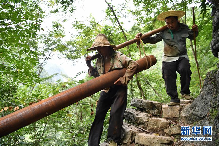 在廣西大化瑤族自治縣板升鄉(xiāng)弄雷村,工人們抬著抗旱飲水工程的水管在山路上前行(2016年8月10日攝)。廣西有近一半貧困人口生活在石漠化地區(qū),涉及數(shù)十個(gè)縣區(qū)。這里也是廣西飲水保障程度最低的地區(qū),解決貧困人口飲水問題是廣西脫貧攻堅(jiān)戰(zhàn)“硬仗中的硬仗”?!笆濉币詠?,廣西加快實(shí)施農(nóng)村飲水安全鞏固提升工程。因地制宜,采取新建、擴(kuò)建及管網(wǎng)延伸等多種措施,補(bǔ)齊貧困地區(qū)水利薄弱短板,進(jìn)一步提升石漠化地區(qū)群眾飲水安全保障水平,助推脫貧攻堅(jiān)。新華社記者黃孝邦攝
