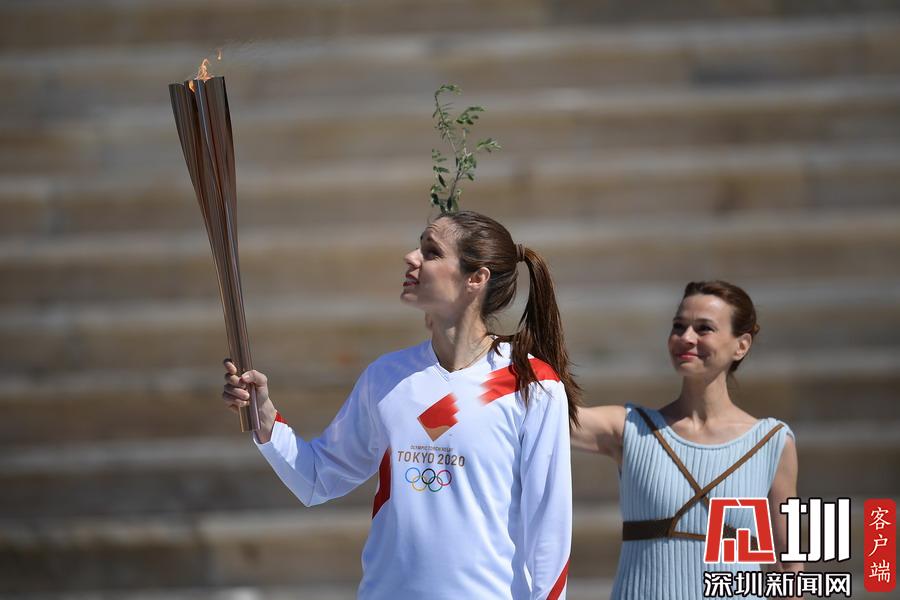 3月19日,最后一名火炬手里約奧運會女子撐桿跳高冠軍、希臘運動員卡特琳娜·斯特凡尼季手持圣火火炬跑向終點。