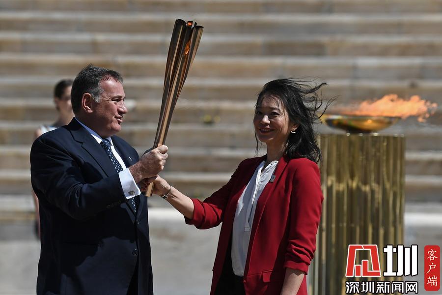 3月19日,日本代表團成員井本直步子(右)從希臘奧委會主席斯皮羅斯·卡普拉洛斯手中接過東京奧運會圣火火炬。
