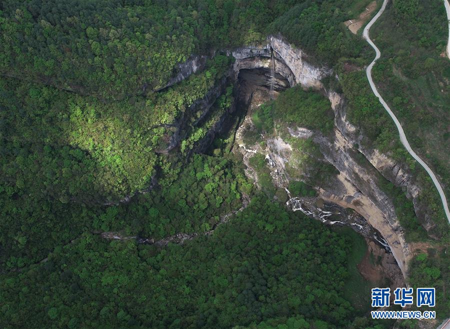 4月22日無人機(jī)拍攝的地洞河天坑。新華社記者張博文攝