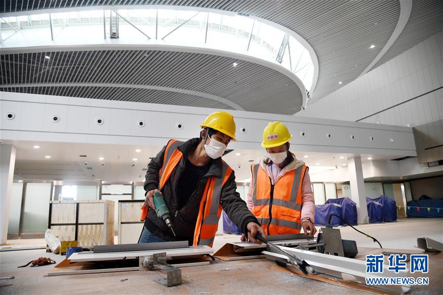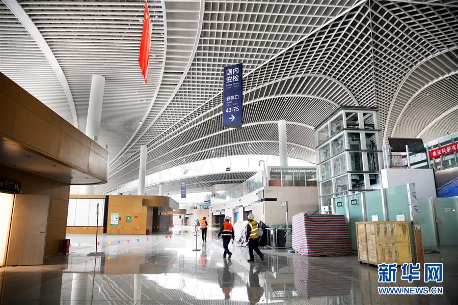 3月25日,幾名工人從建設(shè)中的青島膠東國際機(jī)場航站樓出發(fā)大廳走過。新華社記者李紫恒攝