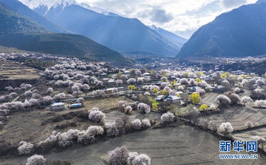 西藏林芝市波密縣境內(nèi)桃花盛開的田園風光(無人機照片,3月26日攝)。新華社記者 晉美多吉 攝