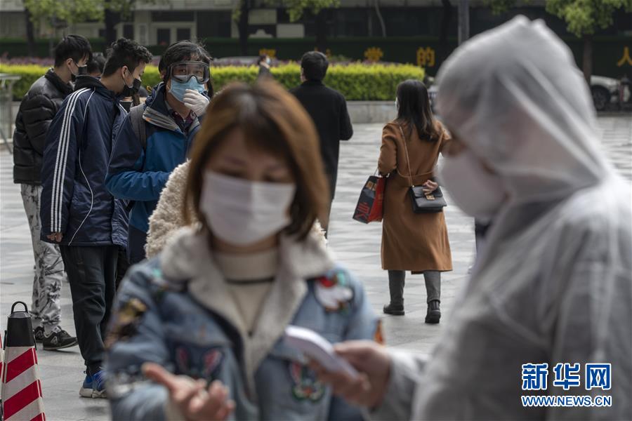 3月30日,在武商國際廣場的超市門口,工作人員在測量顧客的體溫。當日,武漢市多家商場開門迎客。新華社記者費茂華攝