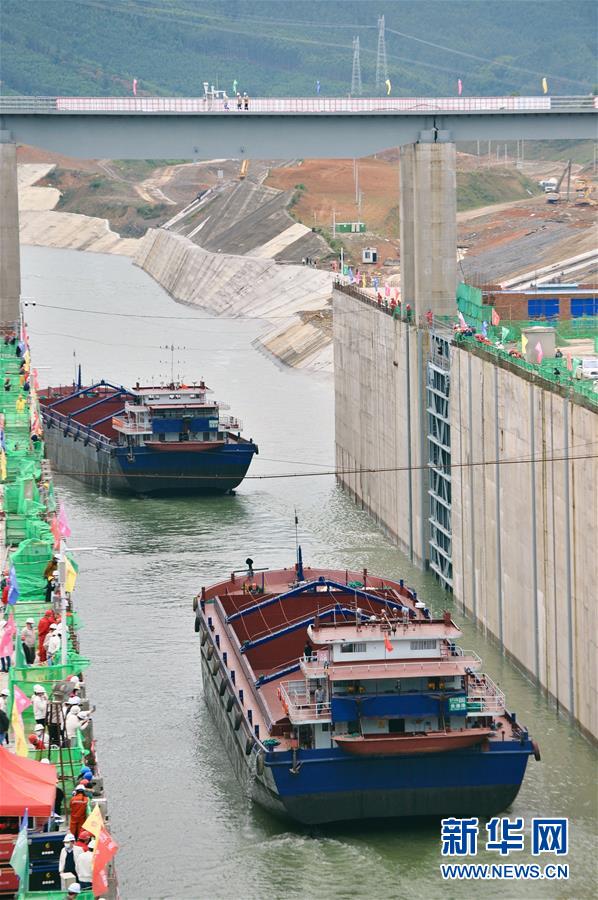 3月31日,船只駛出大藤峽水利樞紐工程船閘閘室。新華社記者崔博文攝