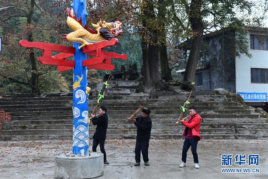 烏英苗寨村民在新蘆笙柱下吹蘆笙(12月22日攝)。新華社記者黃孝邦攝