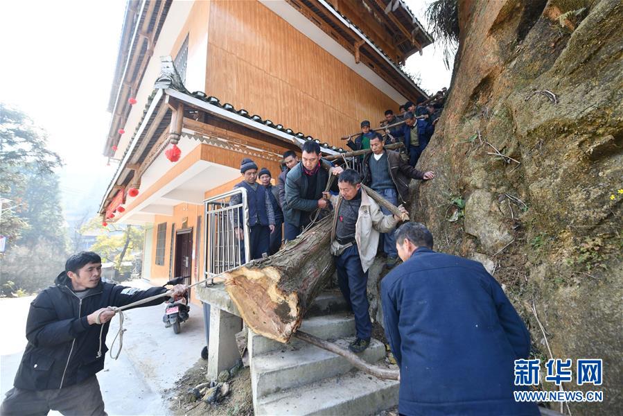 烏英苗寨村民合力抬木頭下山,準(zhǔn)備制作蘆笙柱(12月2日攝)。新華社記者黃孝邦攝