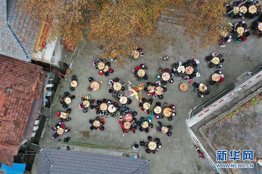 烏英苗寨村民在新蘆笙柱下吃百家宴(12月22日無人機拍攝)。新華社記者黃孝邦攝