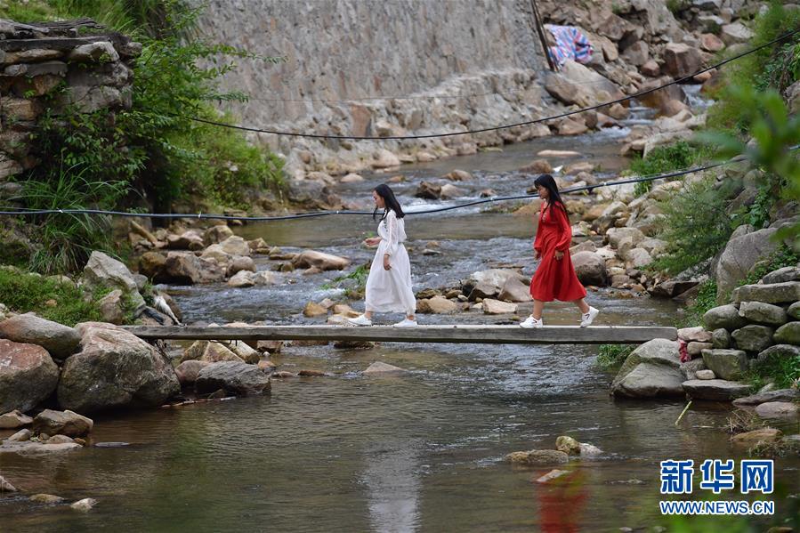 兩名女孩從烏英苗寨的烏英河橋上走過(9月2日攝)。新華社記者黃孝邦攝