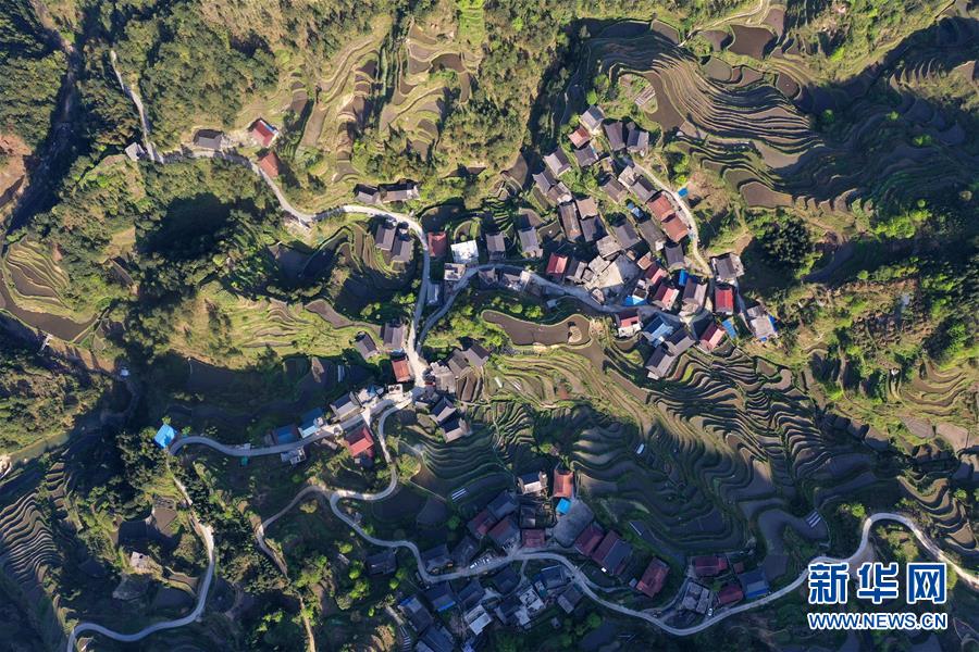 這是融水苗族自治縣桿洞鄉(xiāng)小河村高羽苗寨的木樓和梯田(3月31日攝,無人機照片)。新華社記者黃孝邦攝