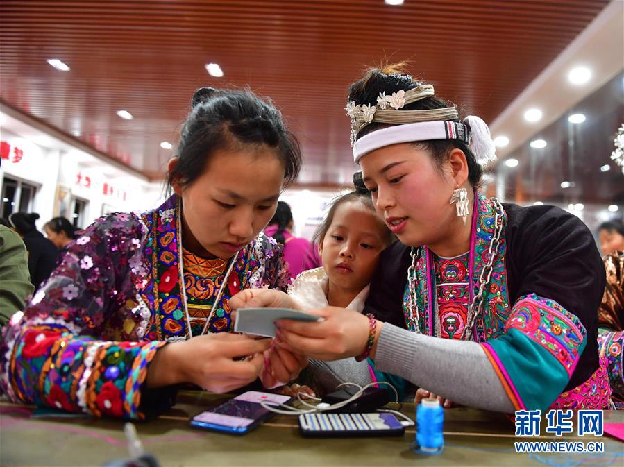 村民在廣西融水苗族自治縣易地扶貧安置點苗家小鎮(zhèn)“婦女之家巾幗扶貧車間”學(xué)習刺繡(2019年11月18日攝)。新華社記者黃孝邦攝