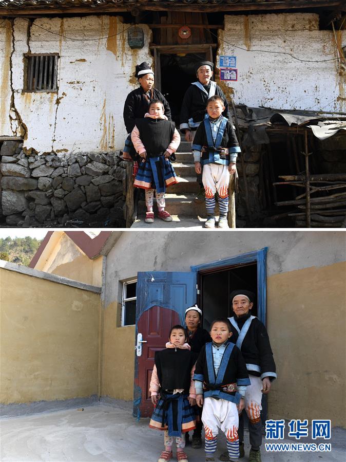 拼版照片:上圖為白褲瑤族同胞韋金林(后排右)與家人在廣西南丹縣里湖瑤族鄉(xiāng)懂甲村搬遷前的老家前(2018年1月11日攝);下圖為韋金林(后排右)與家人在廣西南丹縣里湖瑤族鄉(xiāng)移民集中安置點的新家前(2018年2月5日攝)。新華社記者周華攝