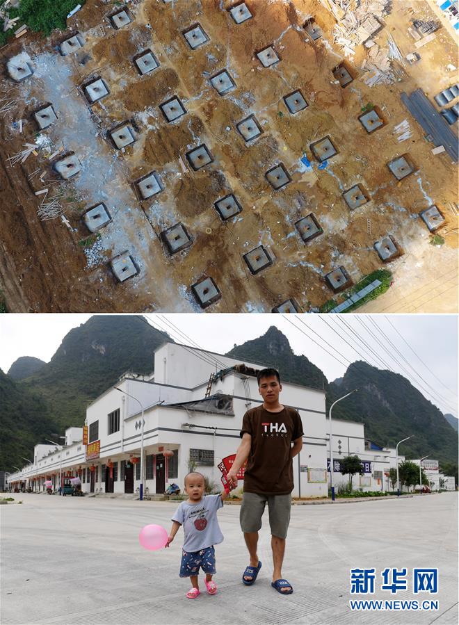 拼版照片:上圖為位于廣西都安瑤族自治縣大興鎮(zhèn)的正在施工建設(shè)的敢皓易地扶貧搬遷安置新區(qū)(2017年7月26日攝);下圖為居民在廣西都安瑤族自治縣大興鎮(zhèn)敢皓易地扶貧搬遷安置新區(qū)散步(2019年10月16日攝)。新華社記者陸波岸攝