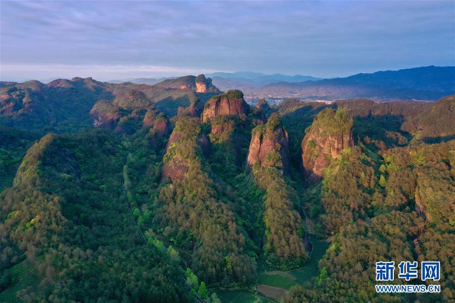 這是夕陽照射下的武夷山國家公園丹霞群巒(4月1日攝,無人機(jī)照片)。 新華社記者 姜克紅 攝