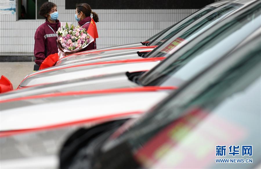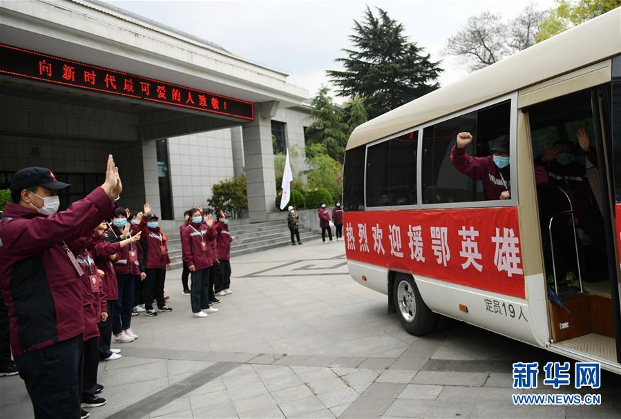 4月3日,乘車(chē)踏上歸途的寶雞市三家醫(yī)院的醫(yī)療隊(duì)隊(duì)員與“戰(zhàn)友”告別。 當(dāng)日,陜西省第一批援鄂醫(yī)療隊(duì)137名隊(duì)員在陜西省工人療養(yǎng)院結(jié)束了為期兩周的隔離休養(yǎng)。醫(yī)療隊(duì)員與“戰(zhàn)友”深情作別后,陸續(xù)踏上歸途。 新華社記者 李一博 攝