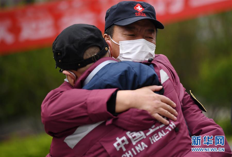 4月3日,陜西省第一批援鄂醫(yī)療隊隊長易智(右)和隊員擁抱作別。 當日,陜西省第一批援鄂醫(yī)療隊137名隊員在陜西省工人療養(yǎng)院結(jié)束了為期兩周的隔離休養(yǎng)。醫(yī)療隊員與“戰(zhàn)友”深情作別后,陸續(xù)踏上歸途。 新華社記者 李一博 攝