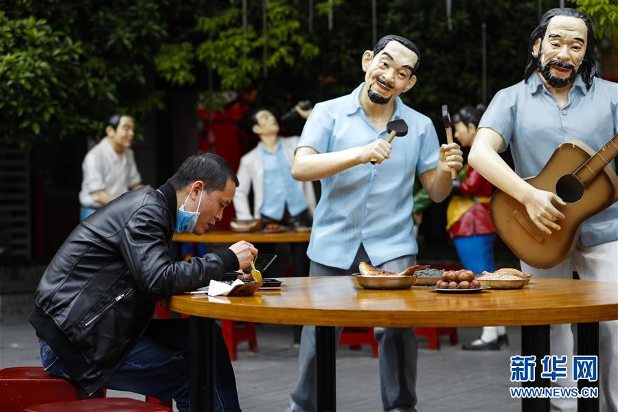 4月5日,市民在武漢市吉慶街的“大排檔”雕塑旁用餐。新華社記者沈伯韓攝