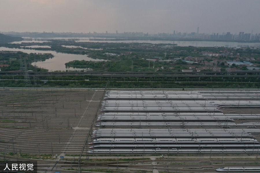 2020年4月6日,武漢動車段高鐵動車組整裝待發(fā)(無人機(jī)照片)。