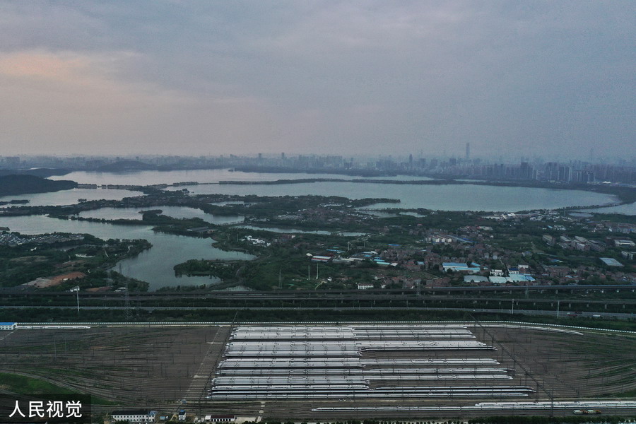 2020年4月6日,武漢動(dòng)車(chē)段高鐵動(dòng)車(chē)組整裝待發(fā)(無(wú)人機(jī)照片)。