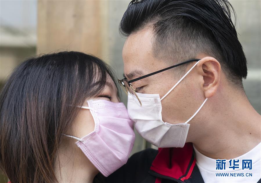 4月7日,在武漢市江岸區(qū)民政局婚姻登記處,陳先生與張女士隔著口罩親吻。 新華社記者才揚攝