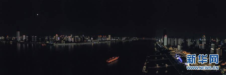 這是4月7日晚拍攝的武漢市江漢關(guān)博物館附近的長江兩岸建筑燈光夜景(無人機(jī)拍攝)。新華社記者沈伯韓攝