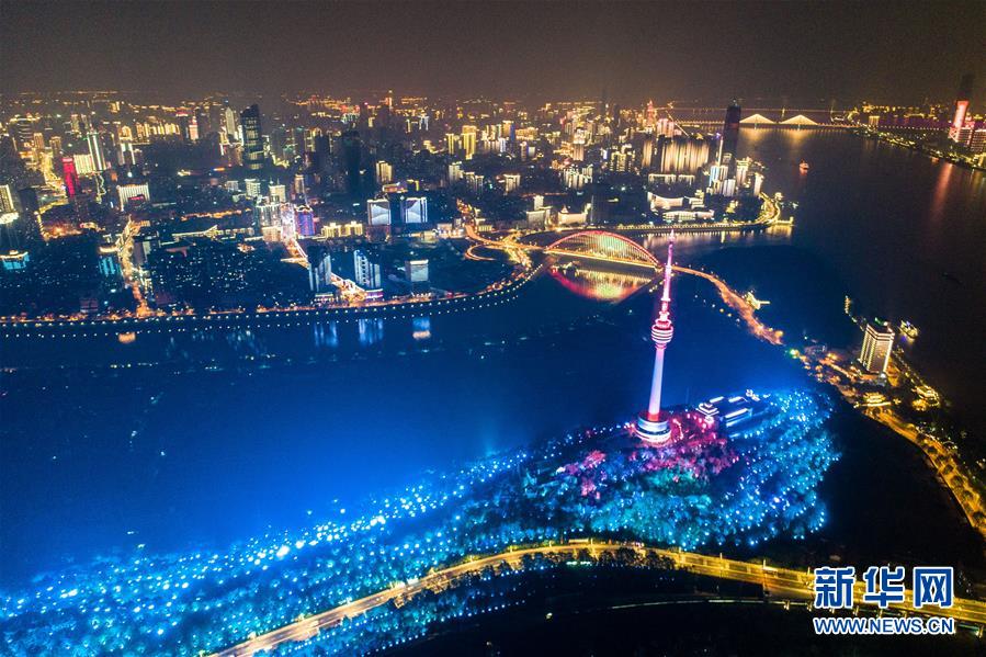 這是4月7日晚在武漢龜山拍攝的夜景(無人機拍攝)。新華社記者肖藝九攝