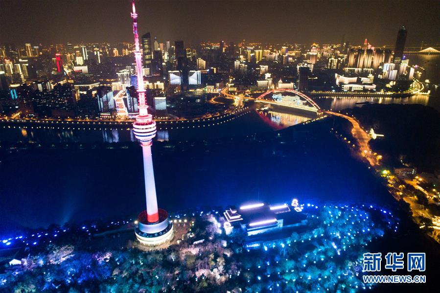 這是4月7日晚在武漢龜山拍攝的夜景(無人機拍攝)。新華社記者肖藝九攝